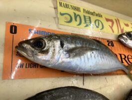 中アジ(13~16cm位)入荷しました。 アオリイカ釣り(ウキ釣り・ヤエン釣り)や船でのノマセ釣りに いかがでしょうか! 1匹税込¥260です お買い求めは、マルニシ本店まで!