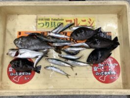 「初めてのつり」様より釣果の持込みをいただきました。 雑賀崎漁港でサビキ釣りを楽しまれたようです。 グレに、豆アジ、スズメダイをゲット! シタビラメは、近くの方からのいただきものとのこと。 好評の「おたのしみブック」もご持参